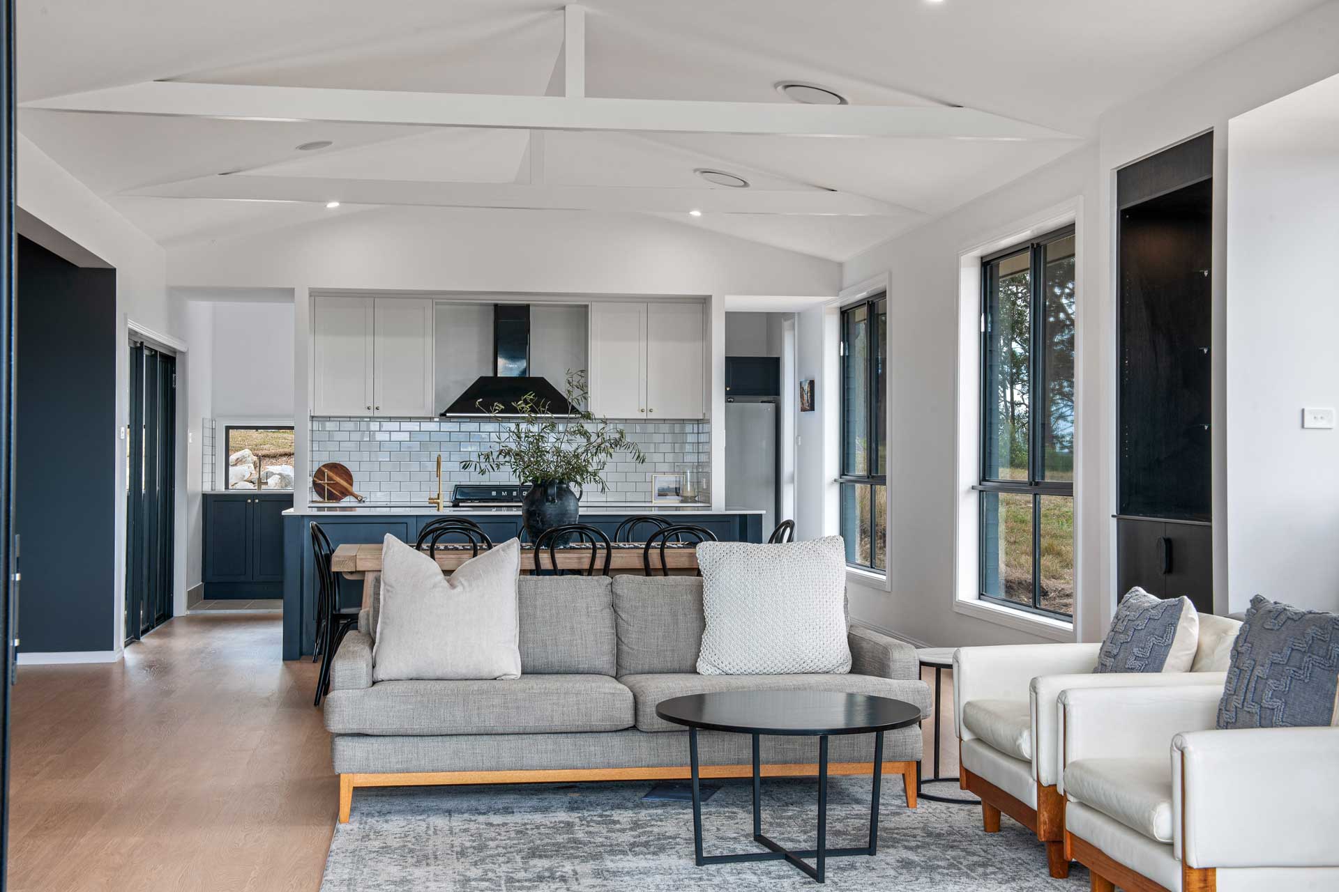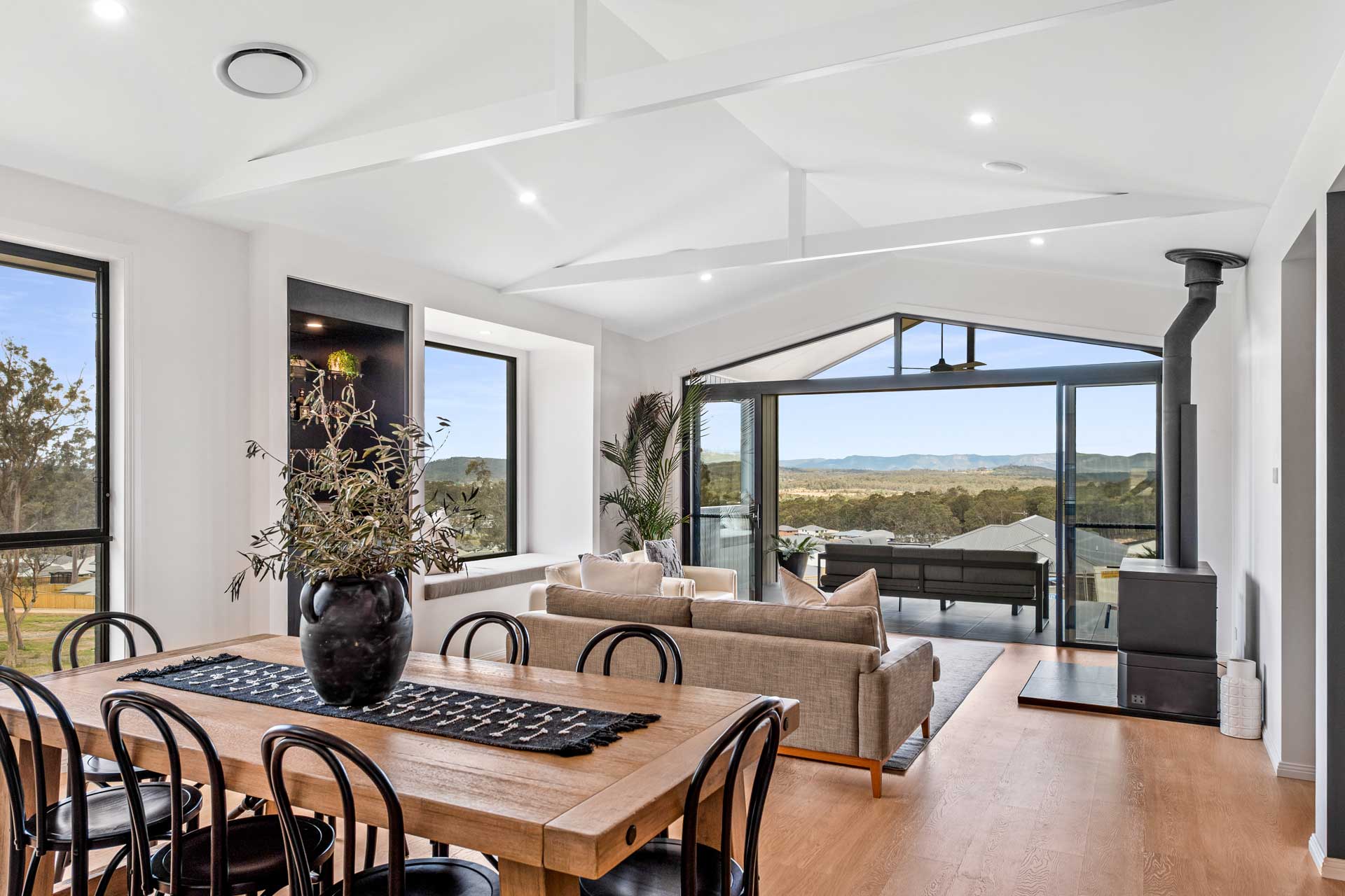 This sophisticated 4 Bedroom Country hilltop home is a reflection of its ability to capture sun and views. Gourmet Kitchen/Dining and Living are combined under a dramatic raked ceiling flowing out to the viewing gallery, the Lounge flows into this area and captures views to the rear, with the Kitchen being centrally connected to both living areas.